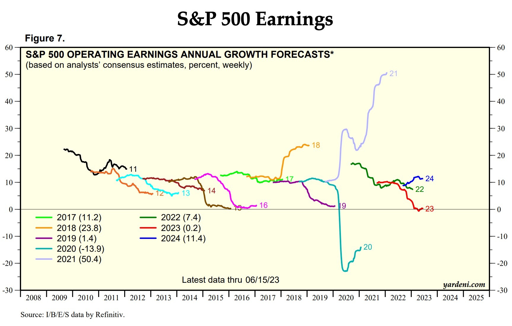 来自投资机构Yardeni的统计数据显示,分析师们普遍预期自今年第三季度开始,标普500指数的整体每股营业利润开始呈现回升态势,并且在第四季度大幅增长。从更长时间线来看,分析师们普遍预期2023年每股营业利润预期已由此前的负值趋于开始缓慢回升,2024年则有望重新实现10%以上高增速。