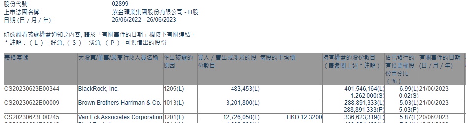 智通财经APP获悉,香港联交所最新资料显示,6月20日,Van Eck Associates Corporation减持紫金矿业(02899)1272.6050万股,每股作价12.32港元,总金额为1.57亿港元。减持后最新持股数目约为3.37亿股,最新持股比例为5.87%。