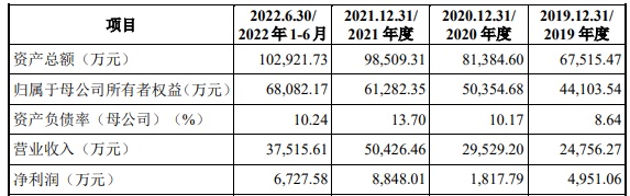 财务方面,于2019年、2020年、2021年、2022年1-6月,该公司实现营业收入分别约为2.48亿元、2.95亿元、5.04亿元、3.75亿元;净利润分别约为4951.06万元、1817.79万元、8848.01万元、6727.58万元。