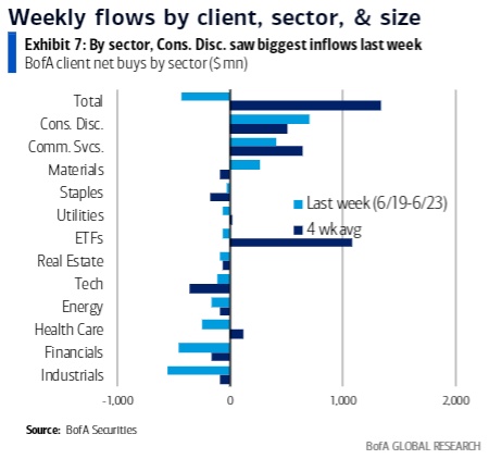 美银表示,ETF也出现了资金流出,该行的客户出售了所有主要风格和规模的基金,包括混合型、成长型、价值型、大型、中型、小型和大市值基金。标普500指数11个板块中有7个板块的ETF出现了资金流出,以医疗保健板块为主。不过,工业板块ETF获得了资金流入,这与工业类个股的趋势相反。