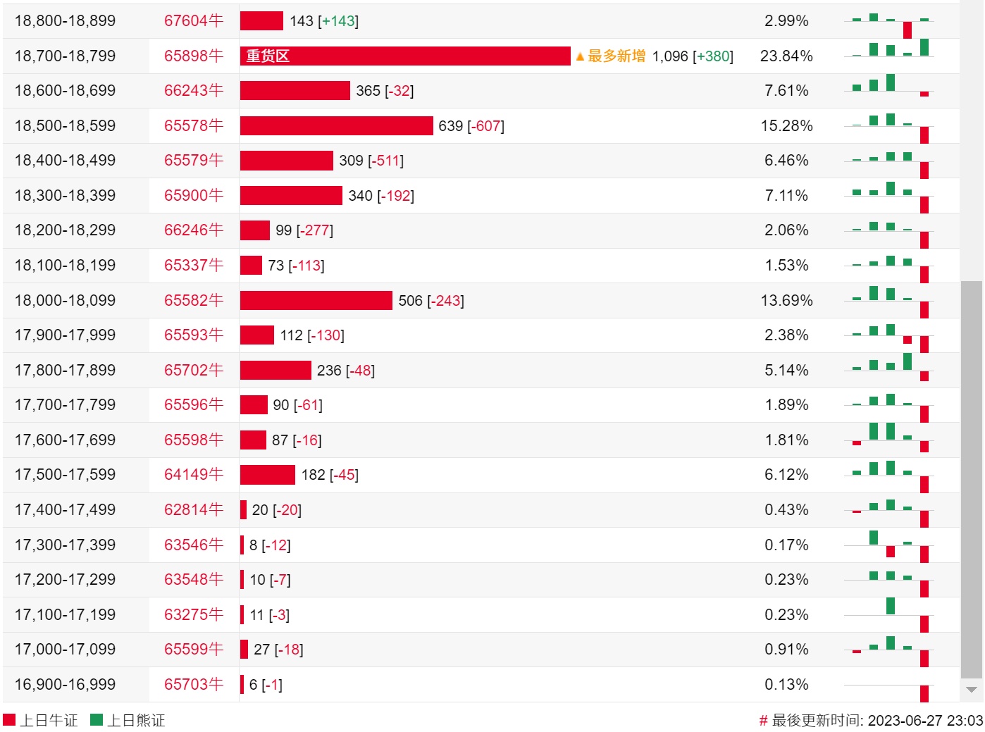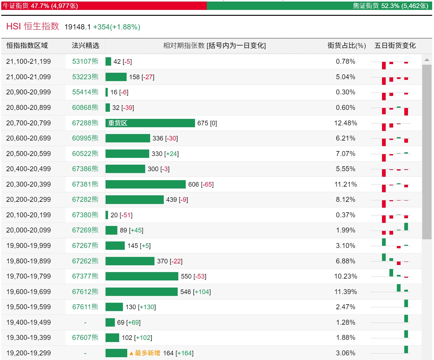 法兴恒指牛熊证街货分布图中的数据显示,熊证街货重货区在20700-20799区间,该区间最新熊证数量为675张,较上一交易日增加0张;最多新增在19200-19299区间,该区间最新熊证数量为164张,较上一交易日增加164张。