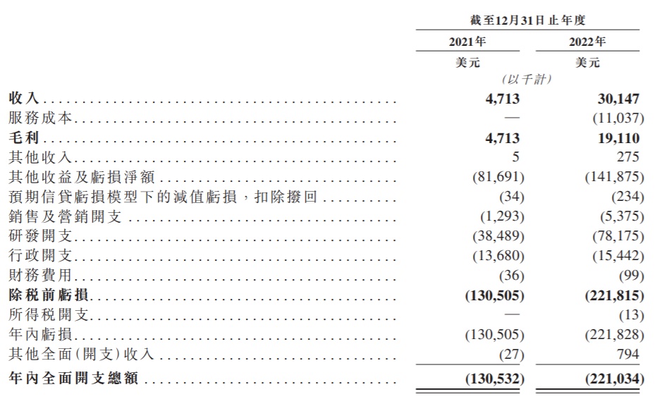 财务方面,于2021年和2022年,英矽智能的收入分别约为471.3万美元和3014.7万美元;同期研发开支分别亏损3848.9万美元和7817.5万美元,该公司称,主要是由于支付予CRO及CDMO的第三方订约成本由2021年的2760万美元增加到至2022年的5380万美元,以及管线扩张令劳工成本由2021年的780万美元增加至2022年的1600万美元。