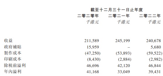 截至2020年、2021年及2022年12月31日止年度,公司收益分别为2.12亿港元、2.45亿港元、2.41亿港元;年内溢利分别为4116.8万港元、3304.9万港元、3943.1万港元。