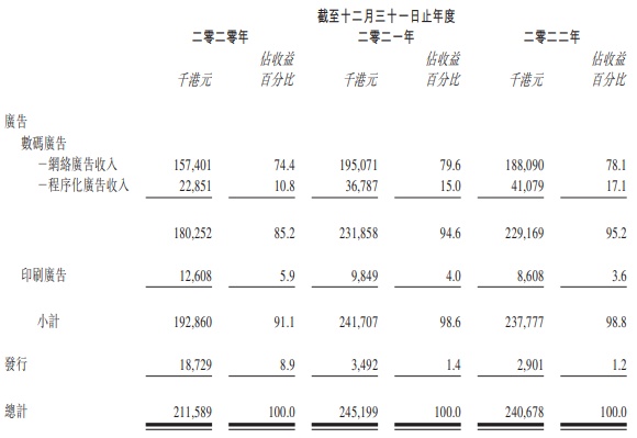 财务方面,截至2022年12月31日止三个年度各年,数码广告业务广告收入占集团总收益分别约85.2%、94.6%及95.2%;发行出版物占集团总收益分别约8.9%、1.4%及1.2%;及出版物的广告收入占于集团总收益分别约5.9%、4.0%及3.6%。