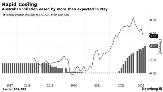 澳大利亚5月通胀逊于预期,令澳洲联储在下周的政策会议上暂停为期14个月的紧缩周期的可能性加大,澳元走低。
