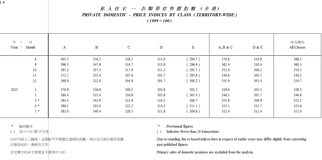智通财经APP获悉,6月28日,香港差饷物业估价署数据显示,5月香港私人住宅售价指数报351点,环比跌0.74%,4月升约0.4%;同比跌近9%。不过,今年首5个月升近5%。5月中小型单位楼价指数环比跌近0.8%,大型单位环比跌约0.7%。同比分别跌逾9%及近3%。