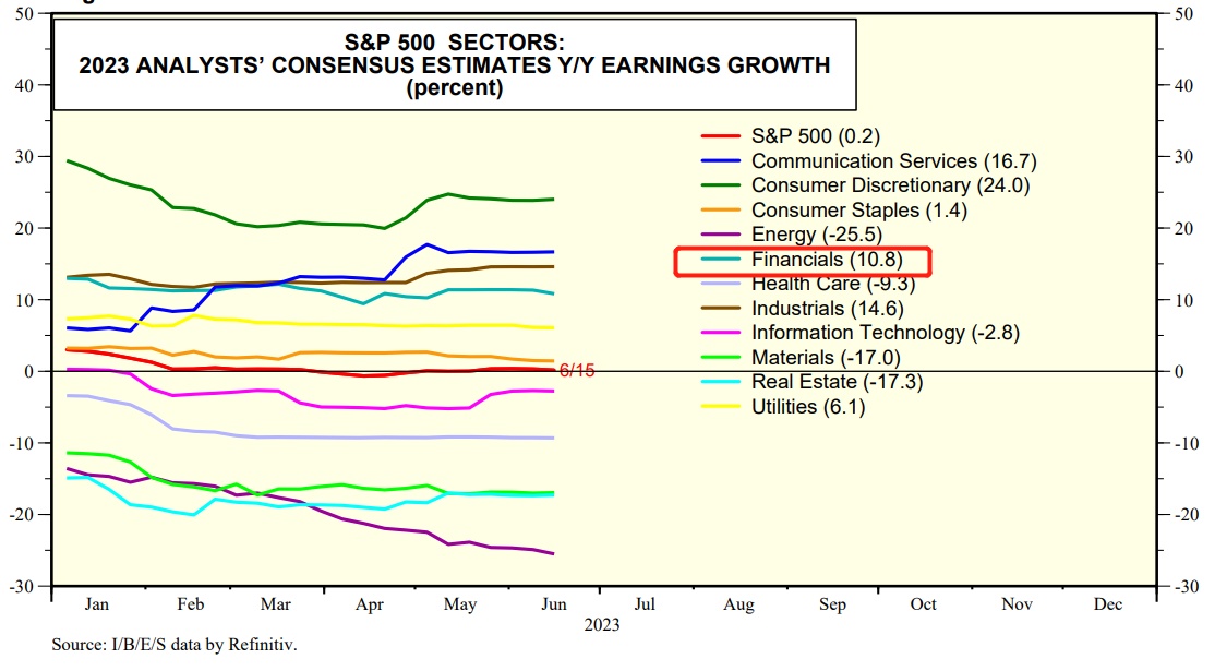 根据投资研究机构Yardeni统计的预期数据,尽管今年经历了硅谷银行破产事件引发的美国地区性银行流动性危机,但是分析师们仍然预期今年标普500指数中的金融行业有望实现高达10%的利润增幅。这也意味着分析师们对于高盛、摩根士丹利等华尔街大行今年的业绩普遍较乐观。在今年第一季度,虽然硅谷银行事件于3月爆发,但华尔街大行Q1业绩普遍超预期。随着第一共和银行银行倒闭,第二季度美国地区性银行危机偶尔小范围内爆发,但分析师们仍然看好美国银行业整体的业绩韧性。