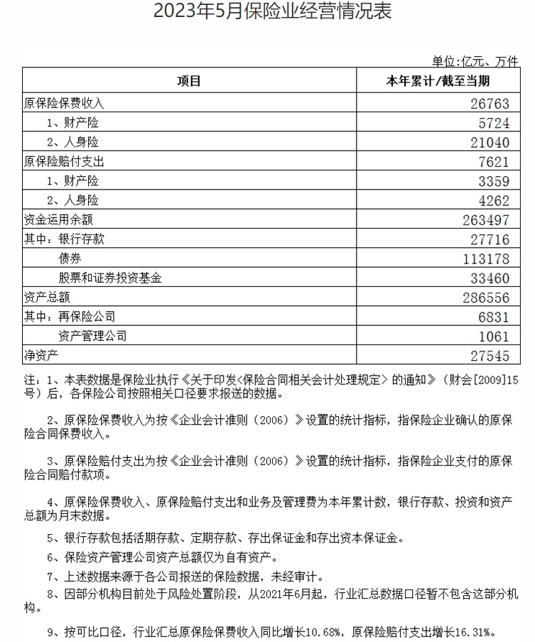 智通财经APP获悉,国家金融监督管理总局近日公布的数据显示,2023年1至5月,保险业累计实现原保费收入为26763亿元,同比增长10.68%。其中,财产险累计实现原保费收入5724亿元,人身险累计实现原保费收入21040亿元。今年前5个月,保险业原保险赔付支出7621亿元,同比增长16.31%。