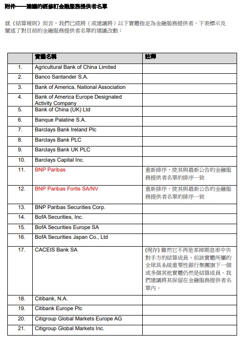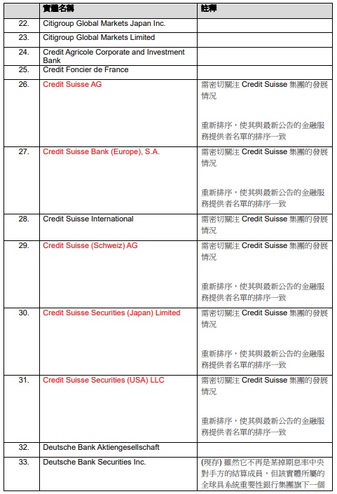 智通财经APP获悉,6月28日,香港金管局与香港证监会就有关根据《结算规则》对场外衍生工具结算制度下的金融服务提供者的名单的年度更新,发表联合咨询总结。值得注意的是,经更新的名单中包括Credit Suisse(瑞信)及其旗下相关金融机构,同时,香港金管局与香港证监会提出,需密切关注Credit Suisse集团的发展情况。