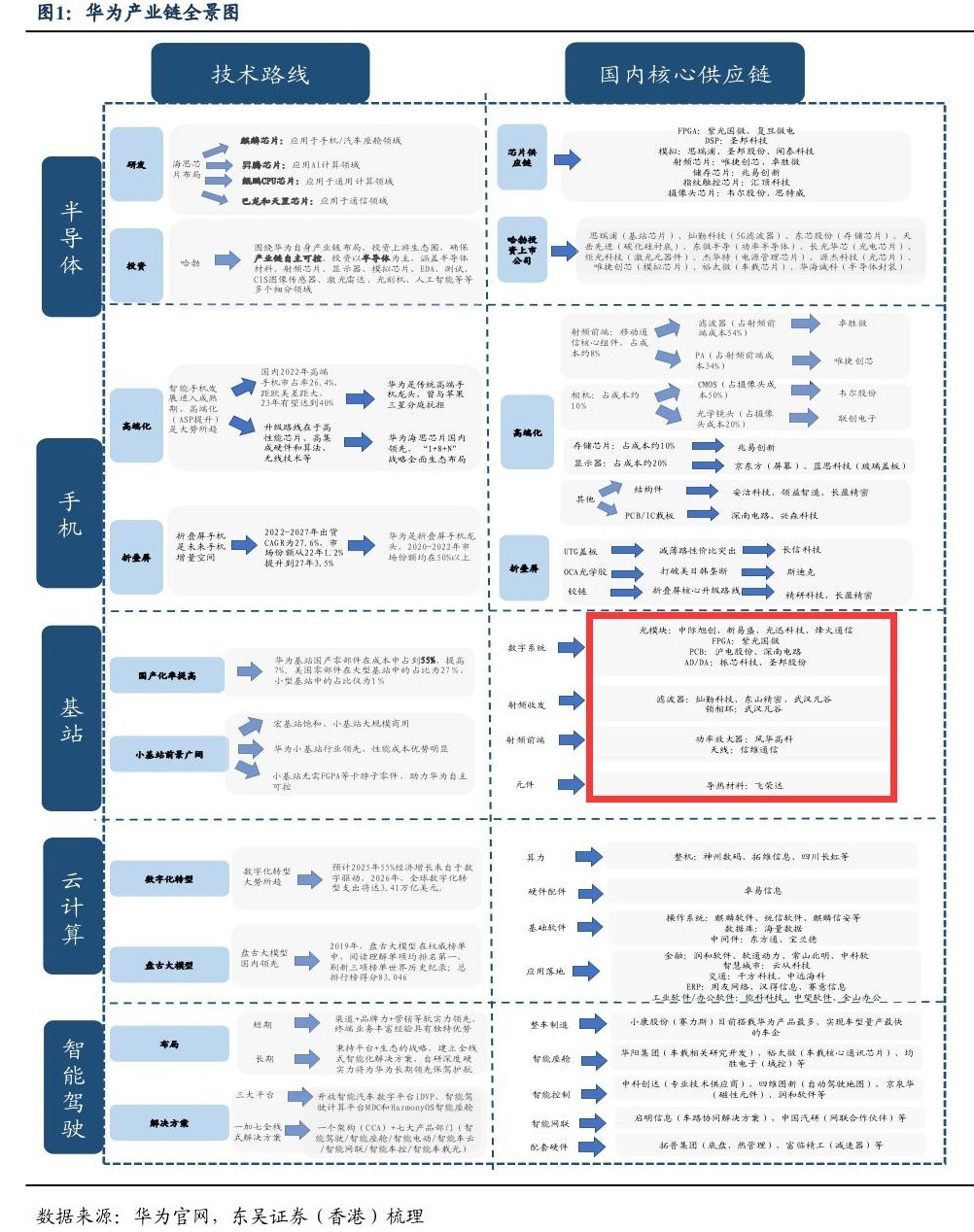 此外,东吴证券整理的《华为产业链全景图》显示,与5.5G关联较大的基站环节,有射频如东山精密、武汉凡谷、风华高科、信维通信等公司。