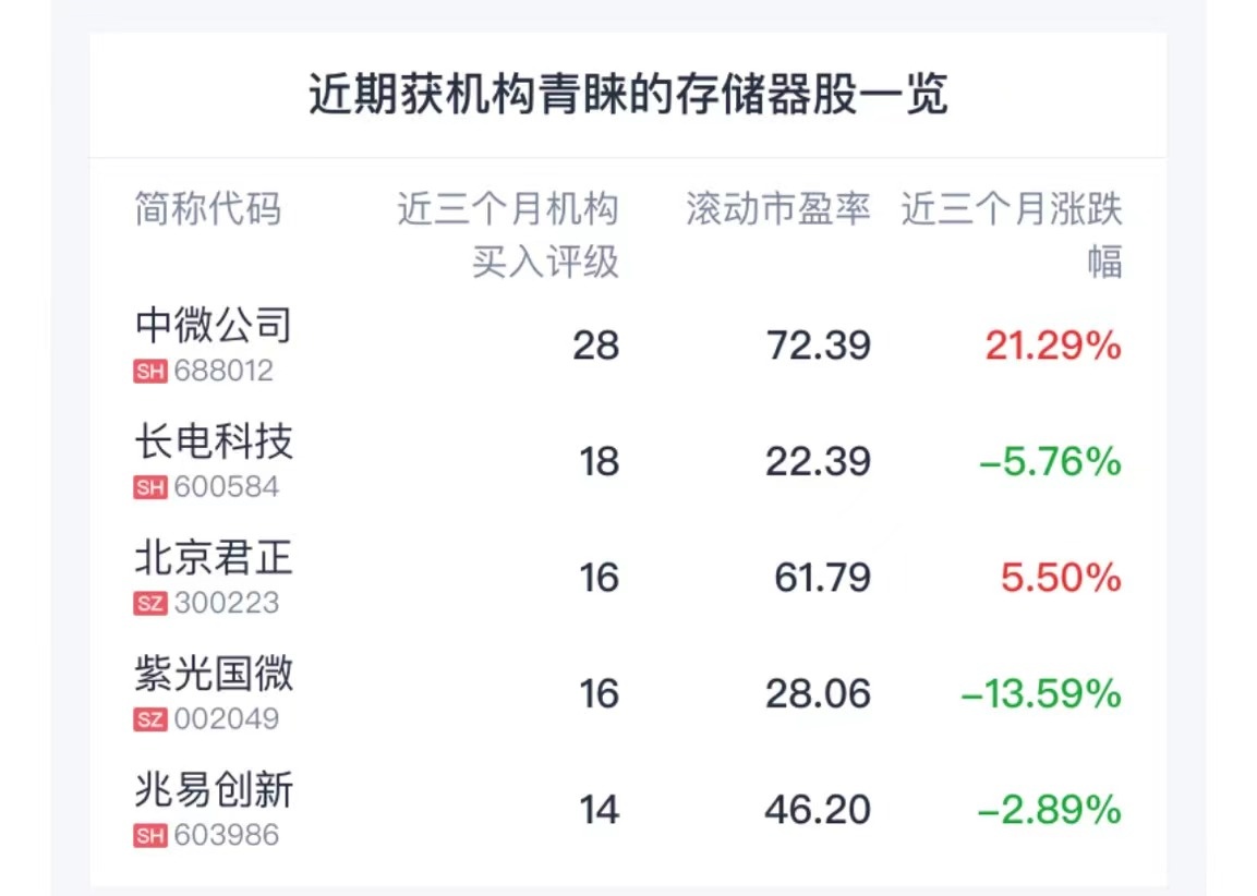 此外,腾讯自选股统计了近三个月获机构青睐的存储器股名单,仅供读者参考。数据显示,近三个月中微公司获28家机构买入评级居首,其次的长电科技、北京君正、紫光国微、兆易创新均获机构买入评级超10家。
