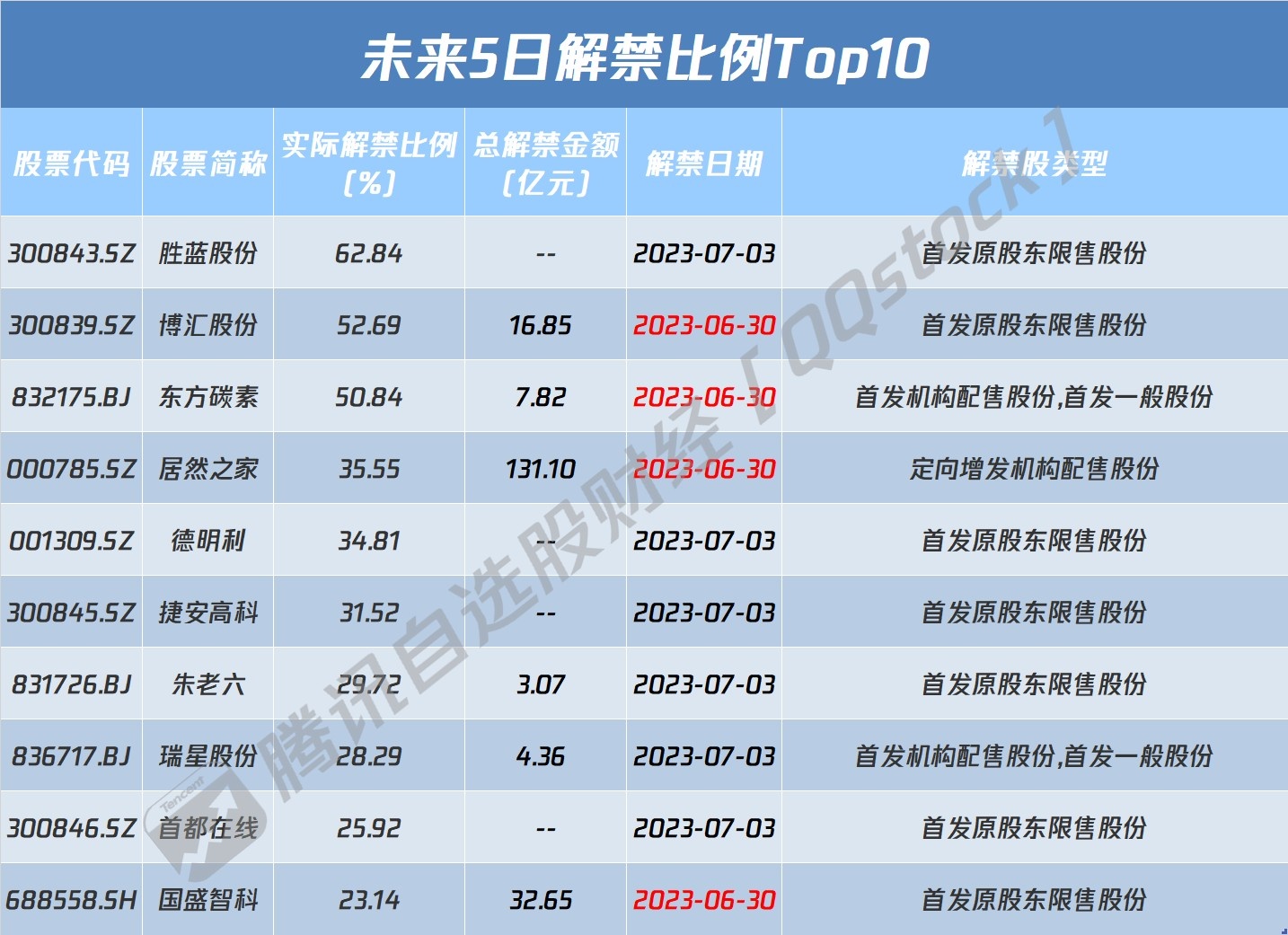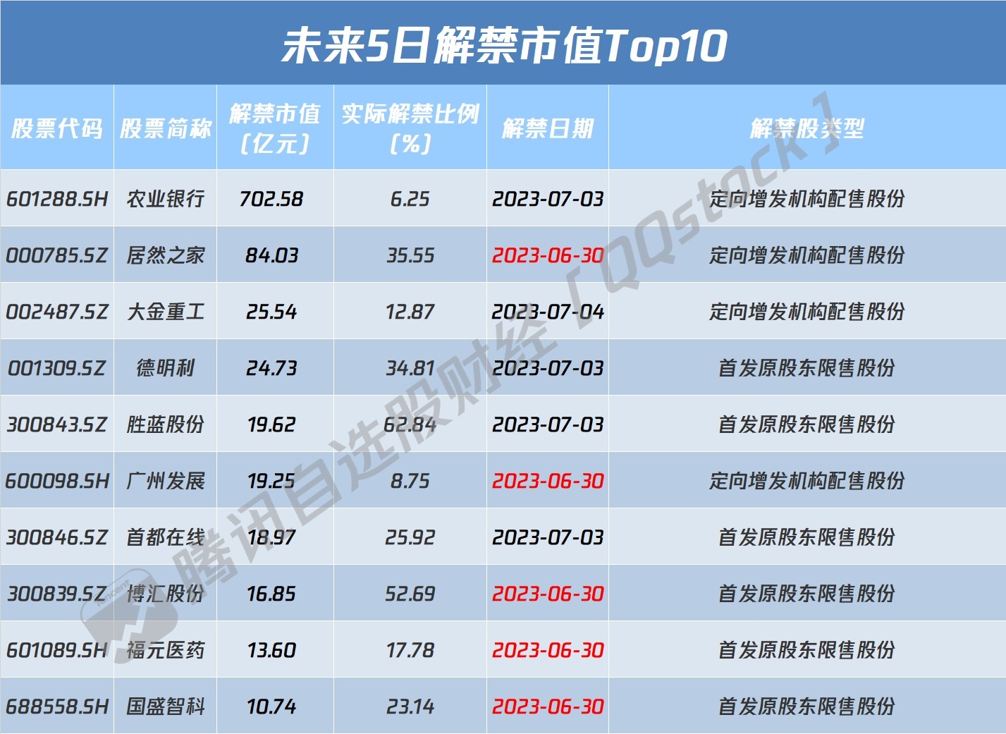 从解禁比例来看,未来5日胜蓝股份解禁比例达62.84%,其次解禁比例居前的分别为博汇股份、东方碳素;从解禁市值来看,农业银行、居然之家等股解禁市值居前。