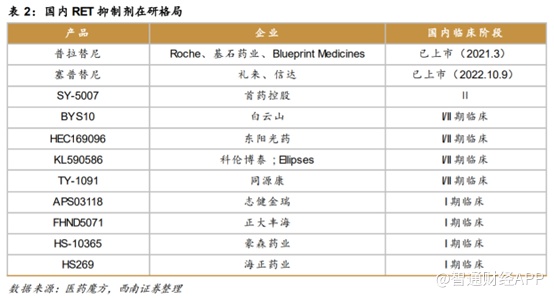 适应症广以外,目前,国内RET抑制剂竞争格局也十分宽裕。截至目前,国内仅两款RET抑制剂获批上市,分别为基石药业的普拉替尼和礼来的塞普替尼。其中,普拉替尼是中国首款上市的精准靶向RET抑制剂,比塞普替尼上市时间快1年半,其他在研的产品多数处于I/II期临床试验。与其他竞品相比基石药业的普拉替尼先发优势明显,并且已覆盖三种适应症。上市时间早且多适应症覆盖,基石药业有望享受更多的市场红利。