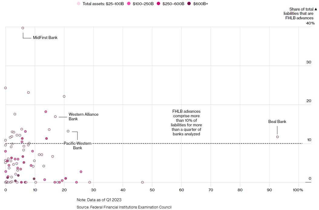 在对所分析的部分银行来说,首季度,联邦住房贷款银行借款占总负债的比例从2021年的不到1%上升到了3.5%。住房贷款银行借款以抵押贷款和其他资产作为担保,其中大部分必须在相对较短的时间内偿还或再融资。
