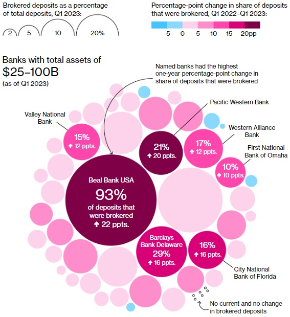 在客户纷纷提款后,为了支撑自己的账目,美国各地的中型银行都转向了其他各种各样的渠道,这些渠道要求的利息要高得多,通常在5%左右或更高。地区性银行又从美联储、联邦住房贷款银行(Federal Home Loan Bank)系统借入了数十亿美元,此外,它们还大量依赖鲜为人知的中介机构组织的经纪存款。