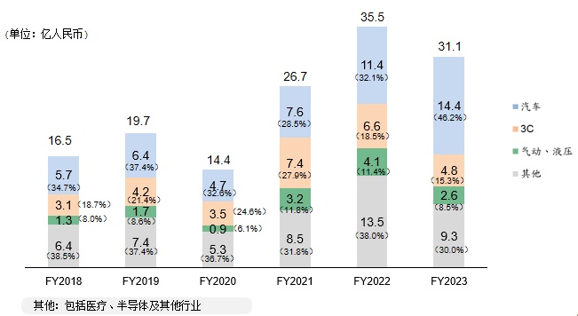 就津上中国内销部分的下游客户所处行业的占比变动趋势来看,亦印证了上述观点。据津上中国业绩发布会披露信息,2023财年公司来源于汽车、3C产品、气动和液压,以及其他行业的客户的收入分别为14.4亿元、4.8亿元、2.6亿元、9.3亿元,其中汽车业是唯一录得同比正增长的行业。