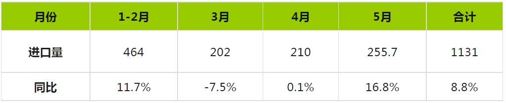 2023年1-5月铜矿砂及其精矿进口量(万吨)