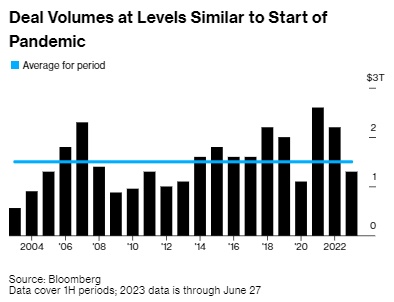 根据汇编数据显示,全球交易量上半年同比下降42%,至1.3万亿美元。不包括受新冠疫情影响的2020年,这是十年来同期的最低水平,低于平均水平。