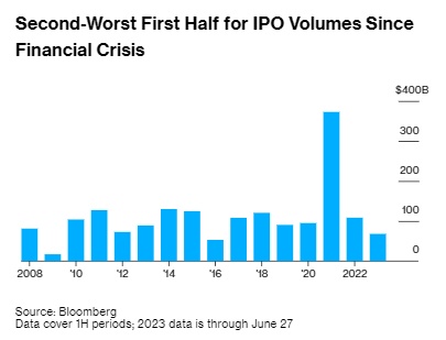 另外,汇编数据显示,年初至今IPO市场的情况几乎没有改善,在2023年前六个月,企业通过IPO仅筹集了680亿美元。这一数字同比下降了三分之一以上。自全球金融危机以来,只有2016年上半年出现了同比下滑。