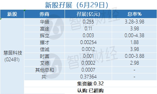 智通财经APP获悉,慧居科技(02481)正在招股中。截至6月29日,华盛、富途等合计为慧居科技借出孖展0.37364亿港元,认购已足额。
