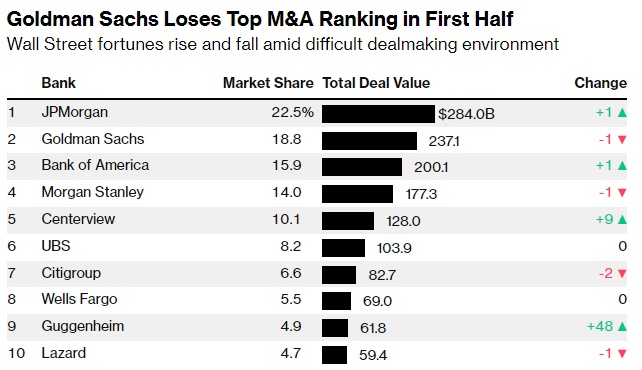 考虑到整体交易数量的急剧下降,排行榜的排名可能不如强劲年份那么能说明问题。高盛仍有可能像过去那样,在12月底前重回榜首。