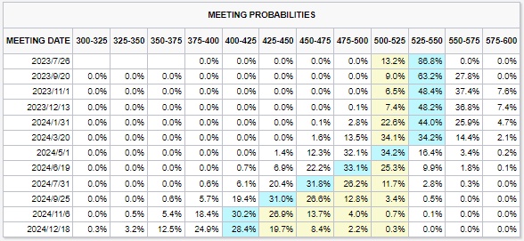 美国GDP数据公布后,债券交易员现在认为,美联储今年再加息两次的可能性较数据公布前有所上涨,而且美联储在今年内转向降息的可能性已经基本消退。根据GME美联储观察工具,市场预计美联储7月加息25个基点的概率为86.8%,9月份再加息25个基点可能性为27.8%。