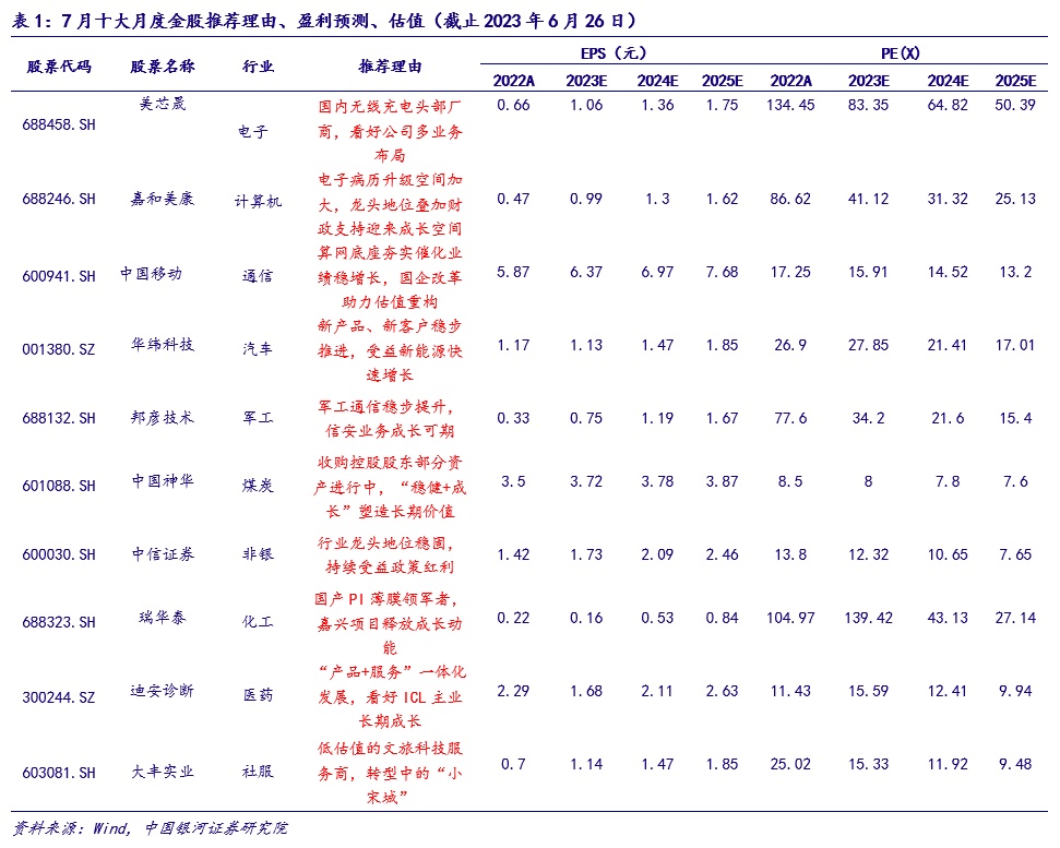 智通财经APP获悉,中国银河证券发布研报称,随着我国经济在新常态下保持平稳运行的良好态势,预计现阶段的投资者观望情绪会逐渐消退。从基本面看,A股站在现在的位置没有继续大幅下跌的基础。当前仍在震荡筑底中,是布局的好时机。该行认为具有长期增长动能的行业可创造稳健的业绩,具有强抗风险能力,是7月配置主要方向,聚焦风险已充分释放+低估值的防御性成长型个股。6月十大月度金股(不分先后)包括:美芯晟(688458.SH)、瑞华泰(688323.SH)、中信证券(600030.SH)、中国神华(601088.SH)、邦彦技术(688132.SH)、中国移动(600941.SH)、迪安诊断(300244.SZ)、嘉和美康(688246.SH)、大丰实业(603081.SH)、华纬科技(001380.SZ)。