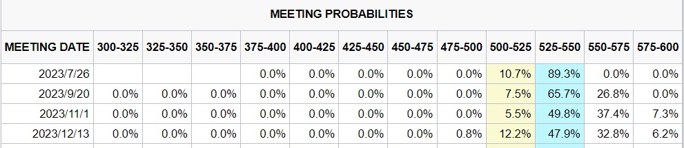 根据CME“美联储观察工具”的预期统计,美联储7月维持利率在5.00%-5.25%不变的概率约为11%,加息25个基点至5.25%-5.50%区间的概率则高达89%;到9月维持利率5%-5.25%不变的概率为8.4%,累计加息25个基点的概率为65.7%,累计加息50个基点的概率为26.8%。此外,交易员们对于2023年美联储降息的押注已经大幅消退,此前一度押注美联储年前降息50个基点。