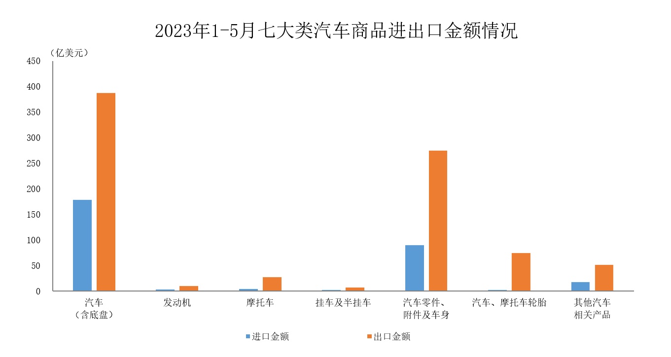 2023年1-5月,全国汽车商品累计进出口总额为1128.8亿美元,同比增长15.4%。其中进口金额296.2亿美元,同比下降25.9%;出口金额832.6亿美元,同比增长43.8%。