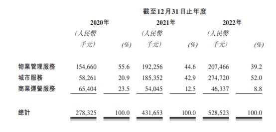 根据业务性质,公司提供的服务可分为三类:物业管理服务(包括对公共物业、商业物业和住宅物业的各种物业管理服务,以及增值服务);城市服务(包括园林绿化及工程、照明系统运营、停车场运营及市政环卫服务);及商业运营服务。