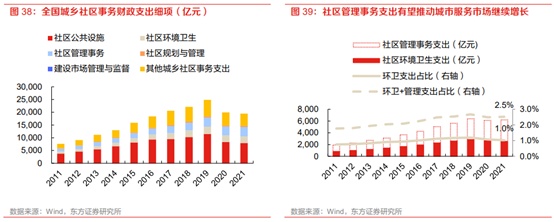 东方证券研报显示,当前城市服务市场空间广阔,狭义上看,2021 年城乡社区环境卫生支出 2521 亿,占全部财政支出比例 1.0%,该比例 20 年以前稳中有增,20-21 年有所下降,目前环卫订单并非全部释放到市场,预计城服覆盖率会持续提升。广义上看,随着城市运营管理的职能逐步从政府部门转移至市场化机构,社区管理事务支出将有望推动城市服务市场继续增长,21年城乡社区环境卫生+管理事务支出共 6189 亿元,占全部财政支出比例 2.5%。