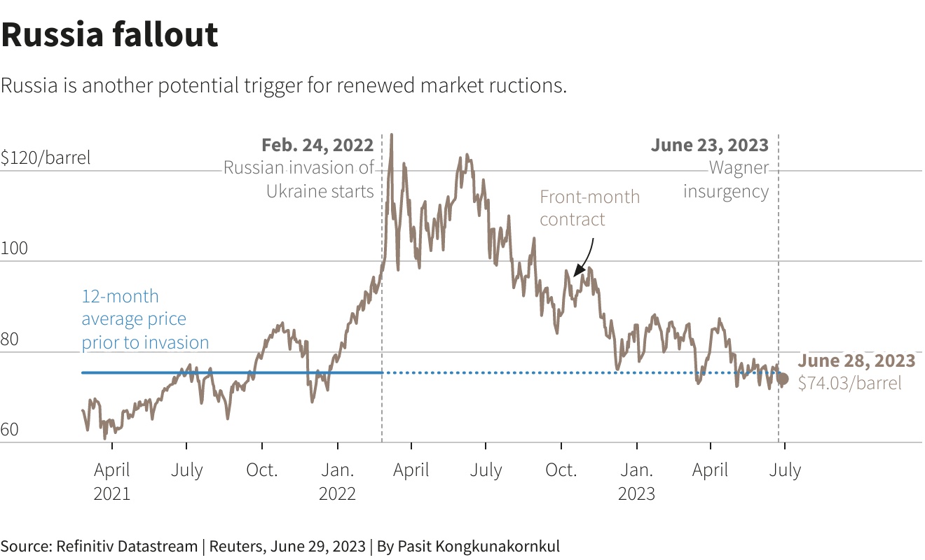 自3月份银行业动荡以来,市场已逐渐恢复稳定,但其他领域的警示灯仍在闪烁,俄罗斯的紧张局势也可能引发压力。