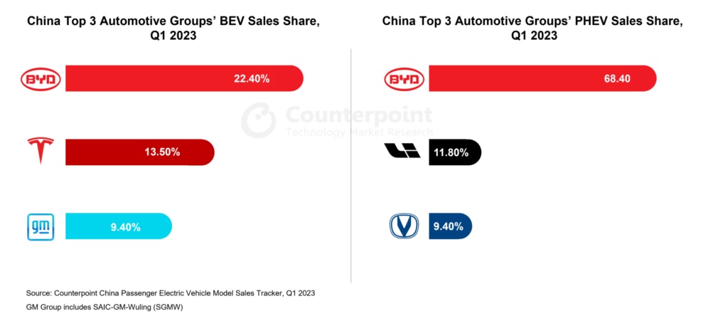 智通财经APP获悉,Counterpoint中国乘用电动车车型销量追踪的最新研究显示,2023年第一季度中国乘用电动车*销量年同比增长29%。纯电动车销量占近70%。插电式混合动力车销量年同比飙升88%。近年来,插电式混合动力车在中国日益普及。比亚迪(002594.SZ)凭借销量增长79%和市场份额年同比增长9.8%,巩固了其领先地位。前十大汽车集团(包括28个品牌)合共占乘用电动车总销量的80%以上。Counterpoint预计,到2023年底,中国的电动车销量将超过800万辆。