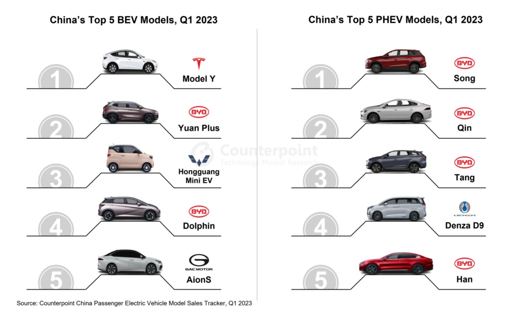 2023年第一季度,前十大最畅销电动车车型中有八款产自中国。除特斯拉外,其他外国车型未能进入前10名。前十大最畅销车型合共占中国乘用电动车销量的46%。此外,2023年第一季度最畅销的前5款插电式混合动力车车型均由比亚迪汽车生产。