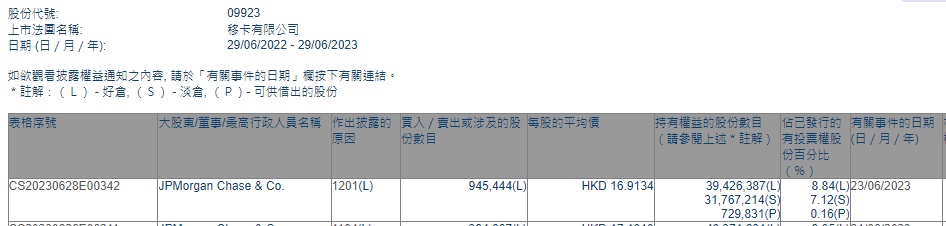 智通财经APP获悉,香港联交所最新资料显示,6月23日,小摩减持移卡(09923)94.5444万股,每股作价16.9134港元,总金额约为1599.07万港元。减持后最新持股数目约为3942.64万股,最新持股比例为8.84%。