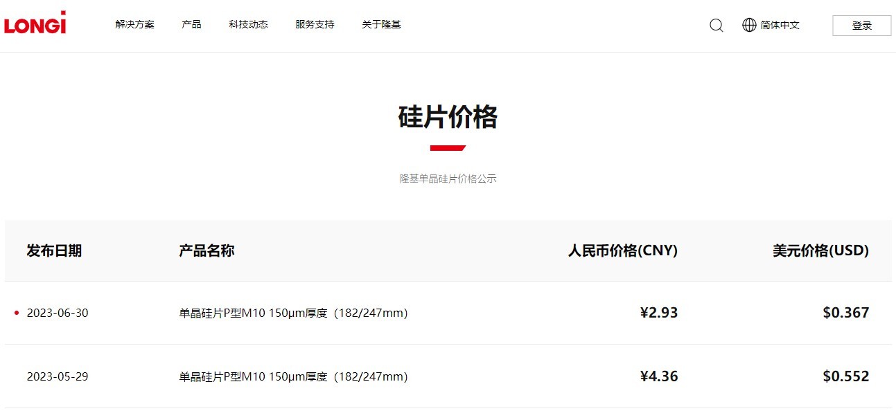 智通财经APP获悉,6月30日,隆基绿能(601012.SH)公布最新单晶硅片价格,“单晶硅片P型M10 150μm厚度”价格由4.36元人民币下调至2.93元,降幅32.8%。