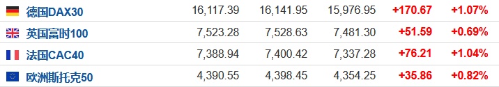 2.截至发稿,德国DAX指数涨1.07%,英国富时100指数涨0.69%,法国CAC40指数涨1.04%,欧洲斯托克50指数涨0.82%。