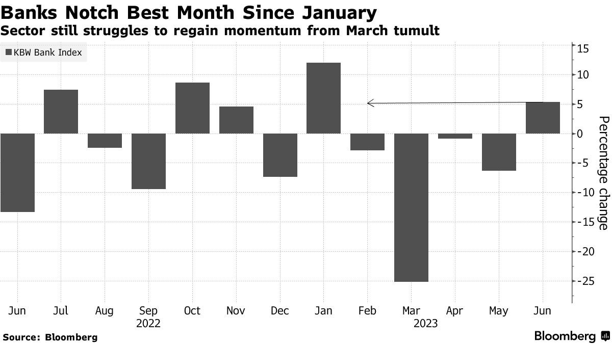 在通过美联储的压力测试后,银行股创下了自3月份硅谷银行破产以来的首次月度涨幅。包括摩根大通等华尔街大行的KBW银行指数在6月份上涨了5%以上,这是自1月份以来的最佳时期。尽管如此,随着更多监管审查的临近,该集团能否保持这一势头仍有待观察。