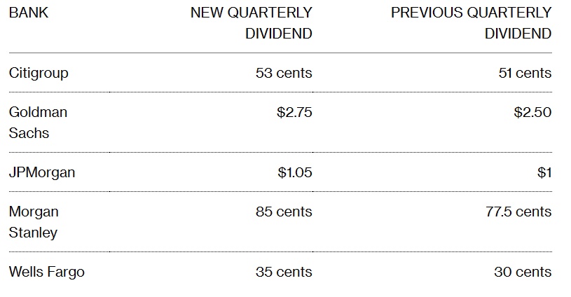 其它银行业巨头方面,高盛将季度股息由2.50美元上调至2.75美元,摩根大通将季度股息由1美元上调至1.05美元。摩根士丹利将股息由77.5美分上调至85美分,富国银行股息由30美分上调至35美分。