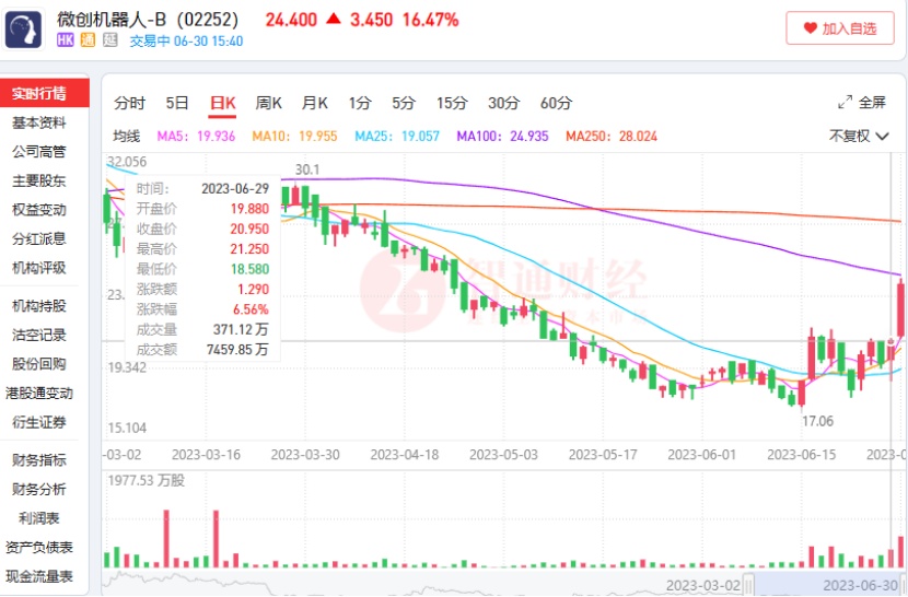 智通财经APP观察到,6月30日,微创机器人股价高开高走,早盘股价涨幅最高达到17.66%。