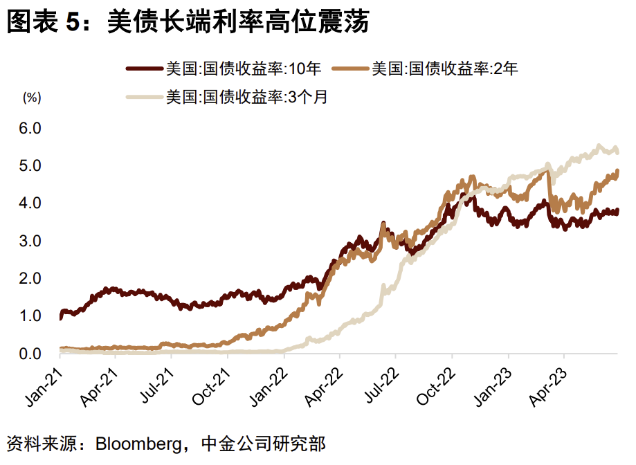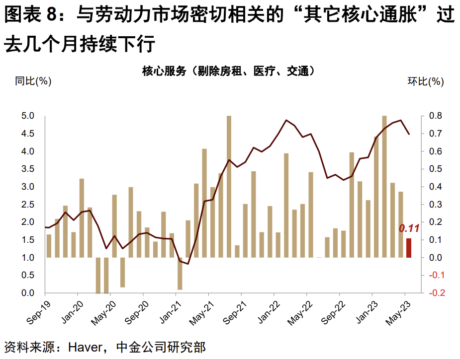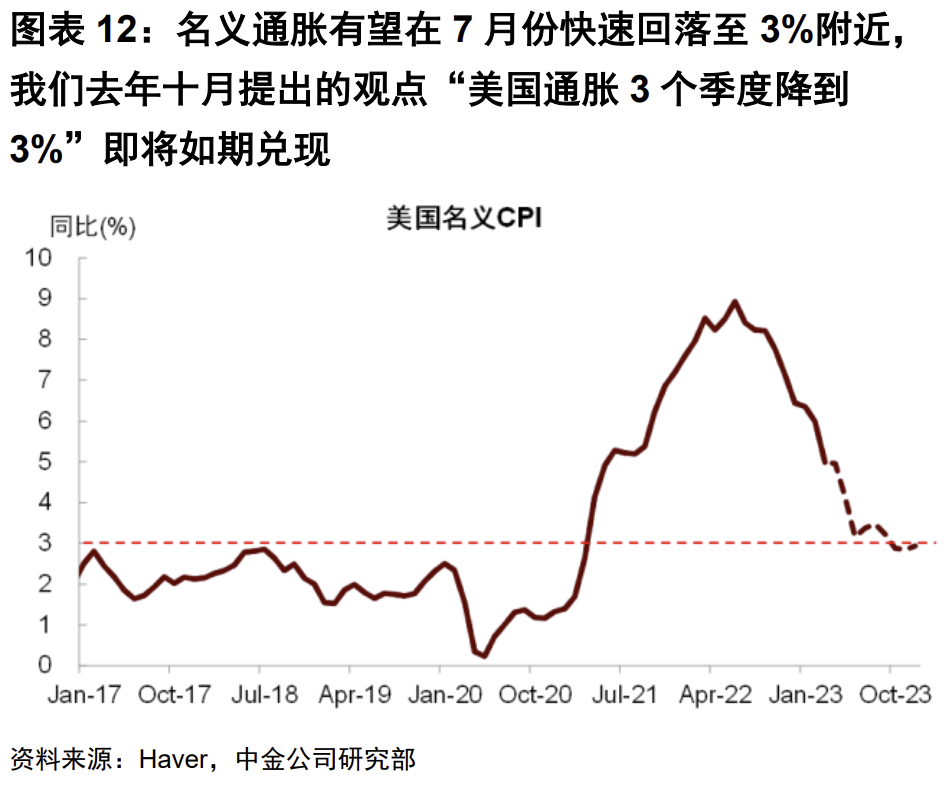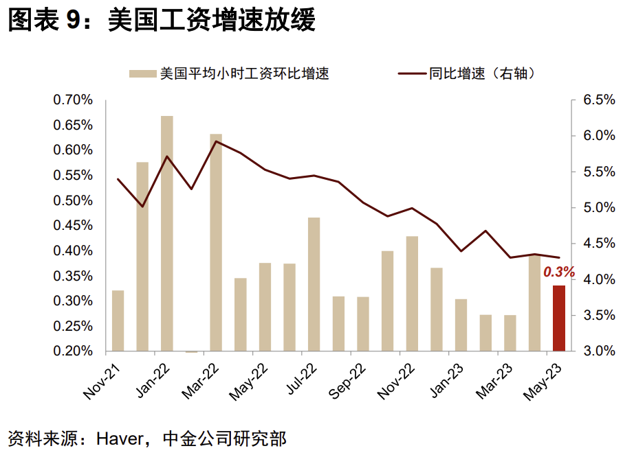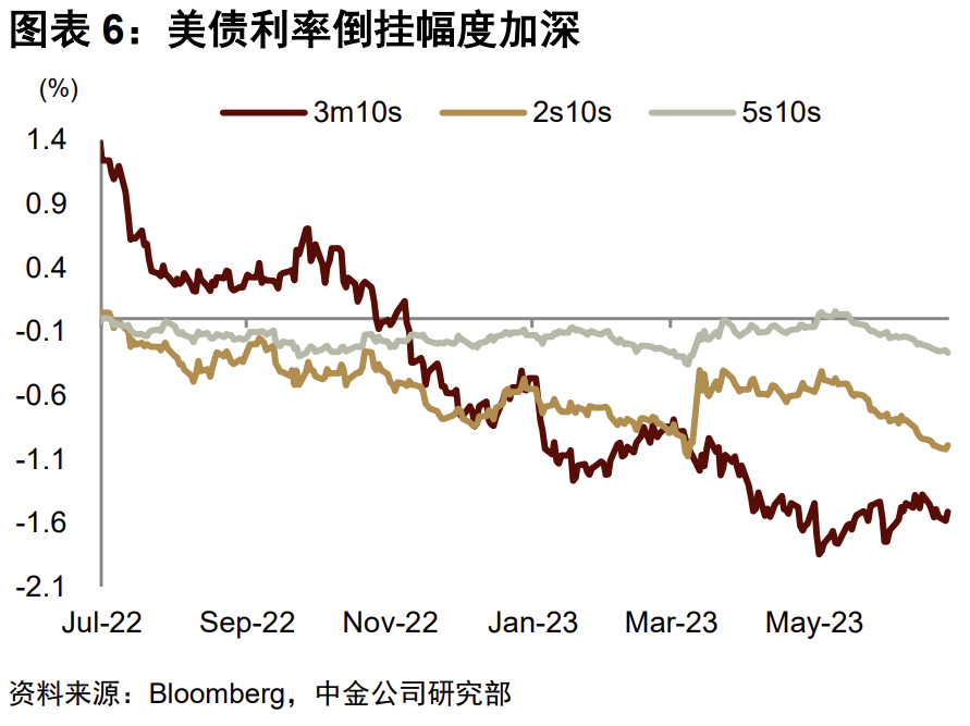 与此同时,“其他核心服务”与“房租”这两个被普遍认为“有韧性”的通胀分项已经进入明确的下行通道:与劳动力市场相关的“其他核心服务”通胀环比增速已经从 0.8%一路降至 0.1%。结合美国工资下降,工人平均工作时间拉长,反映劳动力市场供需正在走向平衡,劳动力市场对通胀的推升效果正在减弱。房租通胀的环比拐点已经如期兑现,2 季度房租通胀从 0.8%快速降至 0.5%,压低核心通胀中枢约 10bp。按权重加总通胀分项,我们的模型显示美国核心CPI 与名义 CPI 环比增速有望在未来 1-2 个月里快速降到 0.2%-0.3%区间。考虑到基数效应,7 月 12 日公布的 6 月名义 CPI 同比增速可能再降一个百分点到 3%附近。我们在去年 10 月提出的观点——“美国通胀在 3 个季度里从 8%快速降到 3%”——大概率会如期兑现。核心通胀同比增速可能在 7 月降到 5%以下,并在未来几个月持续下行。如果上述通胀预测兑现,投资者可能再次博弈宽松交易。我们认为由于美债和黄金已经计入较多紧缩预期,可能迎来明显反弹。如果经济增长与金融系统未来几个月不暴露明显问题,中外股市或有阶段性表现。