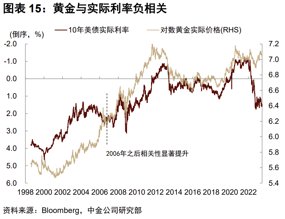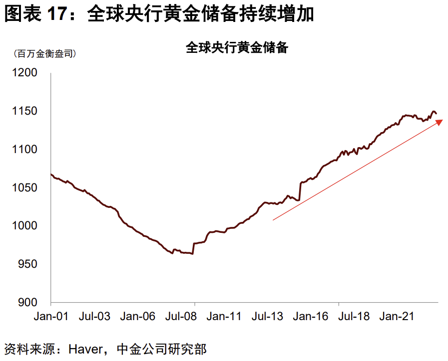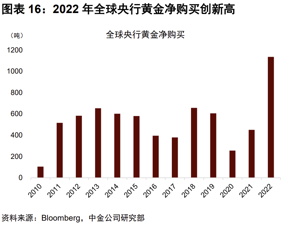 这反映投资者认为美联储可以在未来把通胀控制在目标范围内,因此当前通胀越高,会导致投资者预期美联储加息越激进,继而真实利率越高,但由于长期通胀预期维持相对稳定,因此通胀预期并没有出现明显下行,也就没有明显利空黄金,黄金的短期驱动因素则变成了紧缩预期和实际利率,因此我们观察到黄金与十年期真实利率其实是“一个硬币的两面”。如果 7-8 月份通胀数据改善,可能造成紧缩预期退烧,实际利率下行,有利于黄金表现。2022 年,为应对通胀和地缘政治危机,叠加“去美元化”宏观变局,全球央行购金量同比上升152%达1136 吨,创下历史新高,占到了全球黄金总需求的 24%。2023 年一季度,全球央行黄金购金 228 吨,再创近年来一季度购金新高。后续来看,黄金作为无政治风险、抗危机能力强且具备长期价值贮存功能的资产,在目前全球经济下行、地缘政治风险仍存的背景下,可能仍会受到各国政府与投资者青睐。