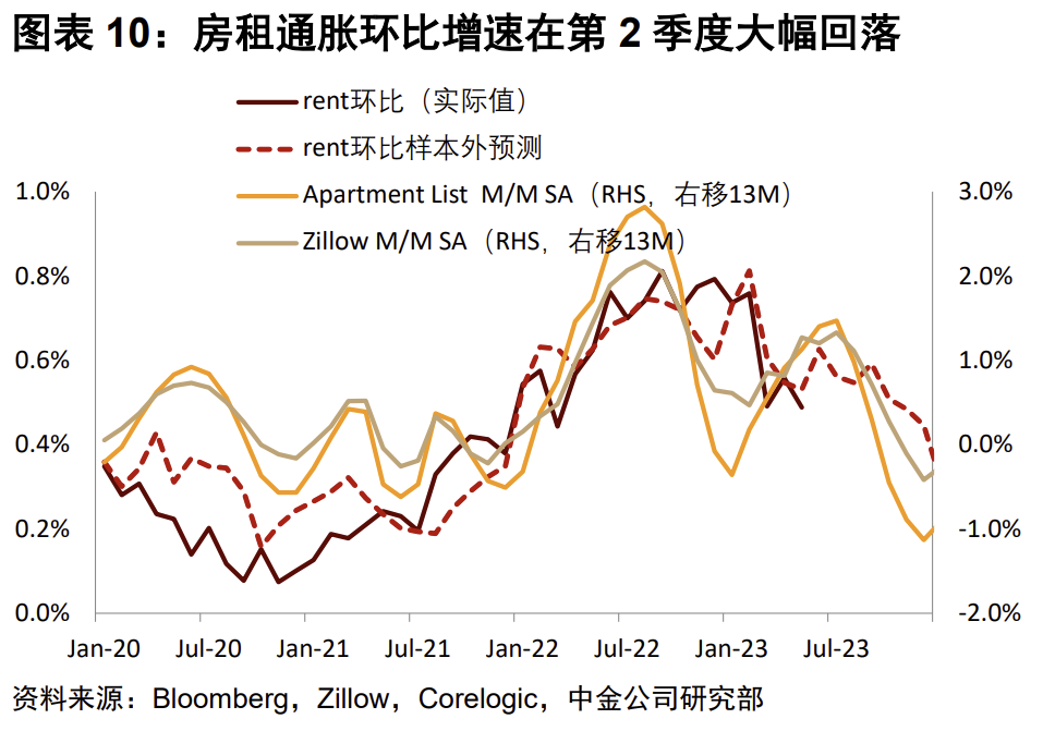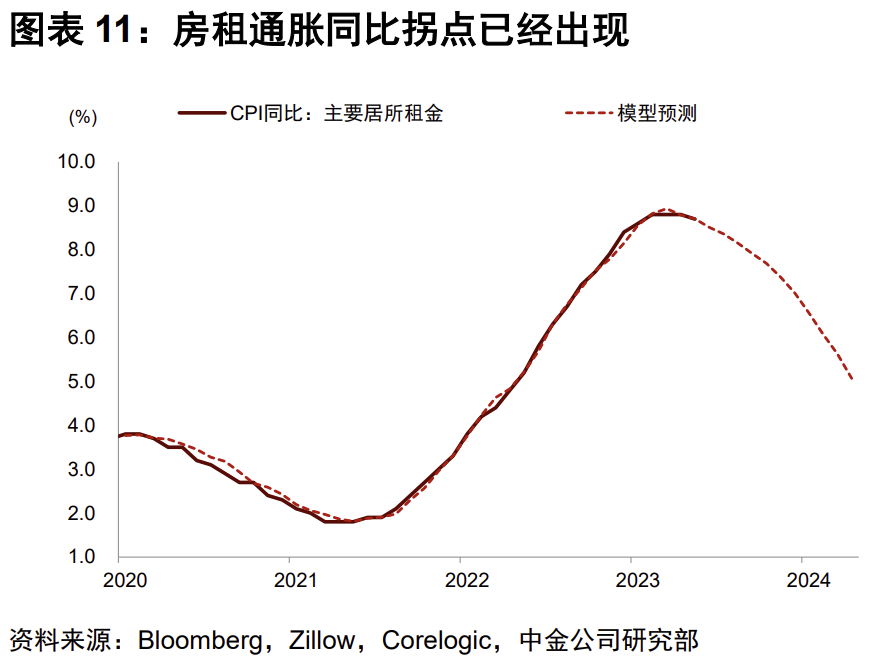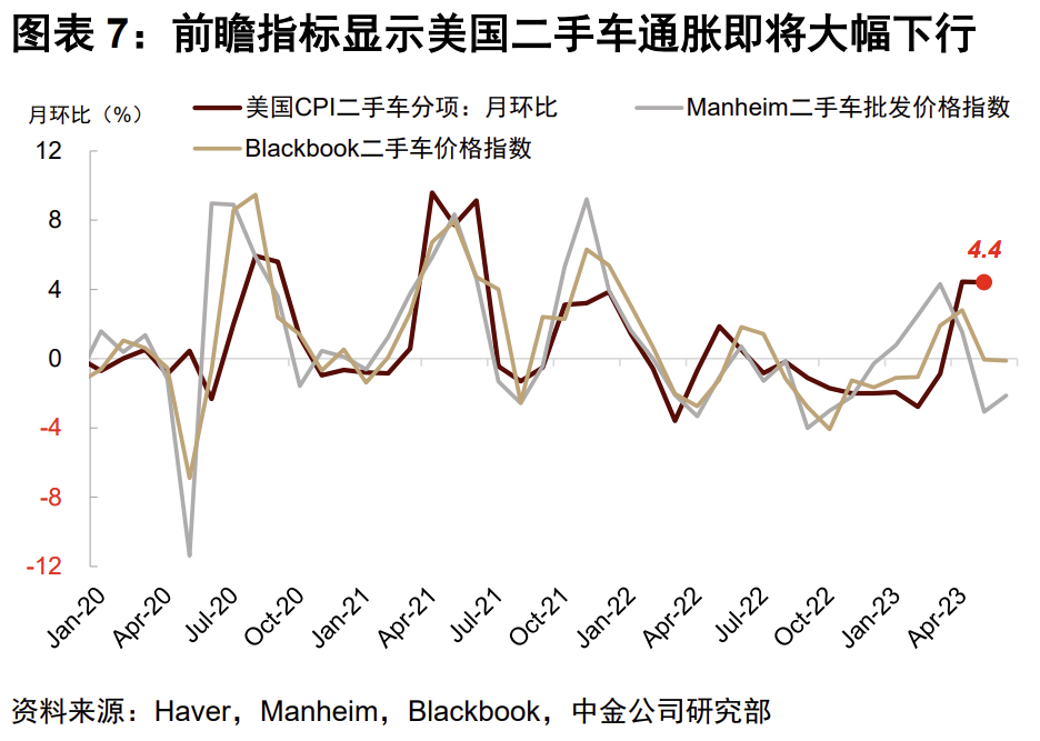 我们把 CPI 按细项拆分,使用统计模型解析分项的运行机制,并预测未来通胀路径(《新视角看通胀变数与资产变局》),发现近期美国核心 CPI 偏高更多受暂时性因素影响,而传统意义上反映“通胀韧性”的通胀分项已经明显退烧。以过去 2 个月为例,二手车通胀环比增速超过 400bp,推高核心通胀中枢 10bp 左右。但二手车市场波动较大,本轮通胀的上涨可能并没有持续性,根据二手车批发市场价格与二手车通胀的领先滞后关系,二手车通胀分项或在未来 2 个月大幅下行,明显压低通胀环比中枢。