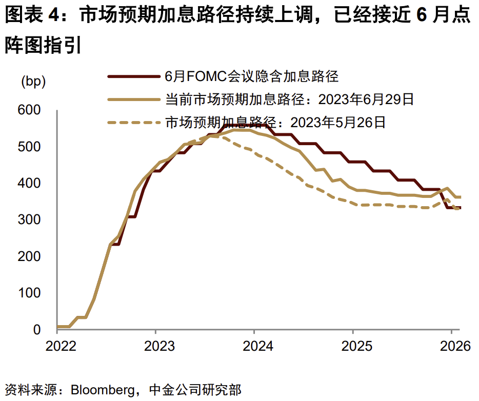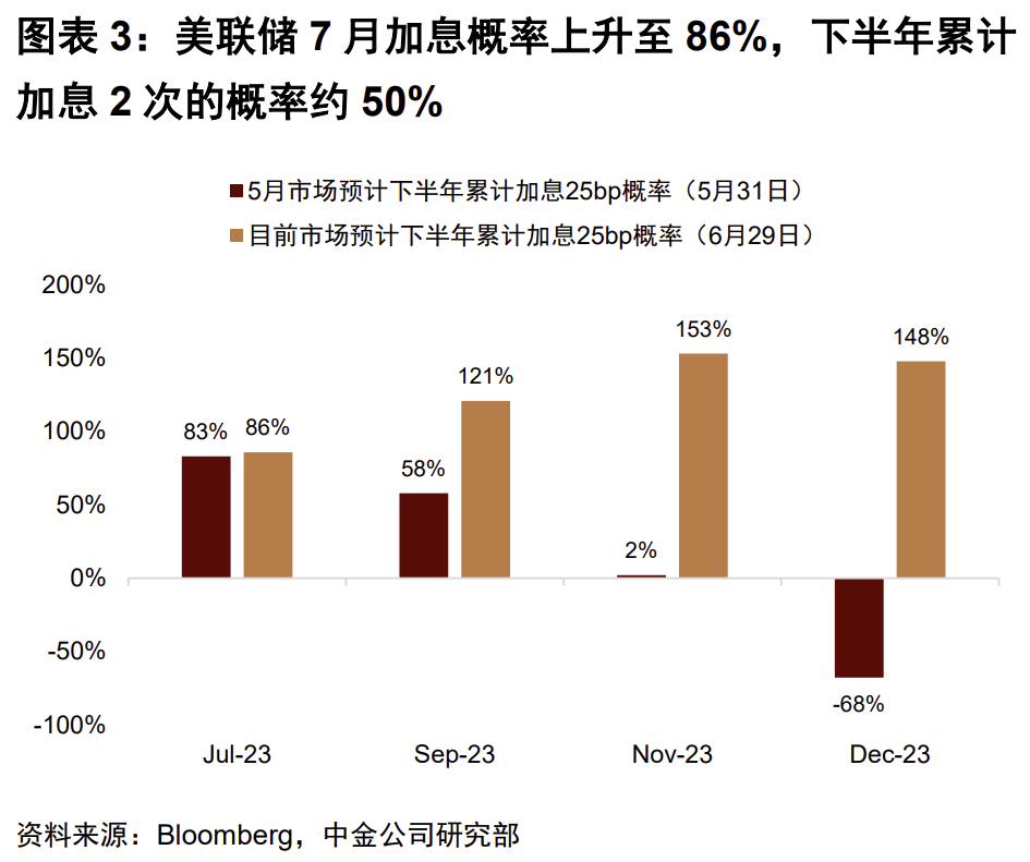 出于对于通胀韧性的担忧,叠加美国经济数据偏强,近期海外央行集体释放鹰派信号。美联储主席鲍威尔6月份多次强调货币紧缩没有结束,下半年可能还会加息两次;英国央行上周大幅加息50bp,超出市场预期25bp;欧央行行长拉加德表示可能在7月继续加息;挪威与瑞士银行上周分别加息50bp与25bp。海外央行集体放鹰,明显扭转市场预期,大类资产交易再次体现“滞胀”特征。美国联邦利率期货市场已经完全回吐了下半年降息预期,7月加息概率上升至86%,下半年累计加息2次的概率约50%。