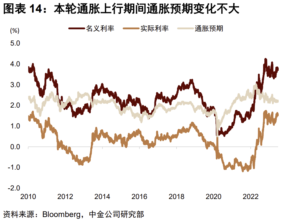 黄金是传统意义上的抗通胀资产,因此一般认为通胀下行利空黄金,而我们认为本轮通胀下行利好黄金,其实并不矛盾,原因在于黄金其实对冲的是“通胀预期”,而不是“实际通胀”。如果投资者对未来的通胀预期下降,黄金才会面临较大压力。但在本轮通胀周期中,通胀预期一直没有太大变化。