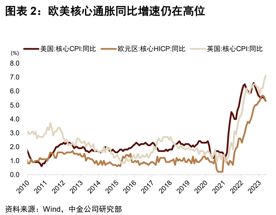 海外通胀暂显韧性,欧美央行态度偏鹰。2023年以来,美国核心CPI环比增速基本都在0.4%以上,年化5%左右,高于美联储2%的通胀目标。5月英国核心通胀超出预期,欧洲核心通胀也维持在高位。