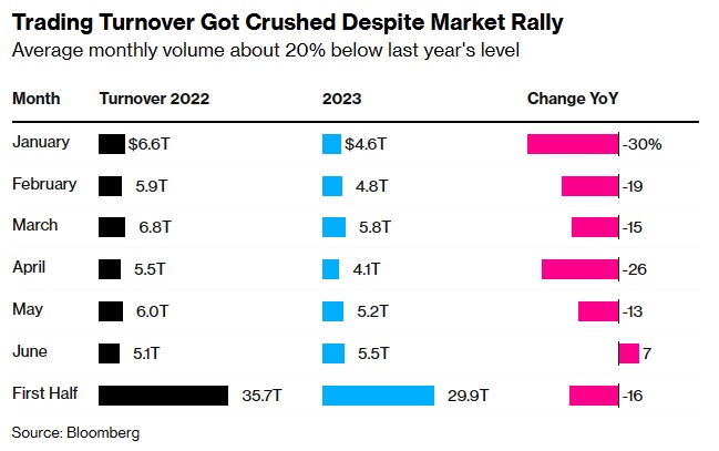 此外,有一个因素可能会加剧下半年的下跌趋势,即交易量过低。尽管美股在6月份进入牛市,但这轮上涨是在市场参与度较低的情况下发生的。标普500综合成交量指数显示,2023年每个月的成交量都在同比下降。