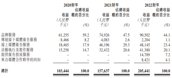 于往绩记录期间,公司向客户提供以下类型的服务:(i)品牌服务;(ii)传统线下媒体广告服务;(iii)线上媒体广告服务;(iv)活动执行及制作服务;及(v)提供广告投放服务(包括来自媒体合作伙伴的回扣)。