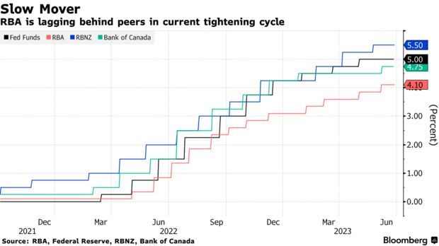 上周,美联储主席鲍威尔、欧洲央行行长拉加德和英国央行行长贝利均表示,他们在抑制通胀方面仍有很长的路要走。美国和英国的加息幅度已超过澳大利亚,欧洲央行的加息幅度也与澳大利亚相当。