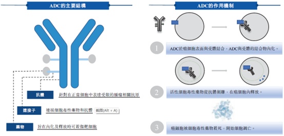 ADC是抗体药物偶联物的简称,是指将高选择性的抗体和强力细胞毒药物通过连接链共价偶联而得的新型生物药,由三个核心成分组成:一个与特定靶点结合的抗体、一个称为有效载荷的细胞毒性药物以及将两者连接的连接子。